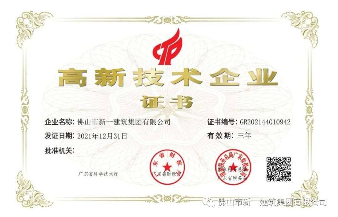 簡(jiǎn)訊|佛山市新一建筑集團(tuán)有限公司取得“高新技術(shù)企業(yè)”證書(shū)